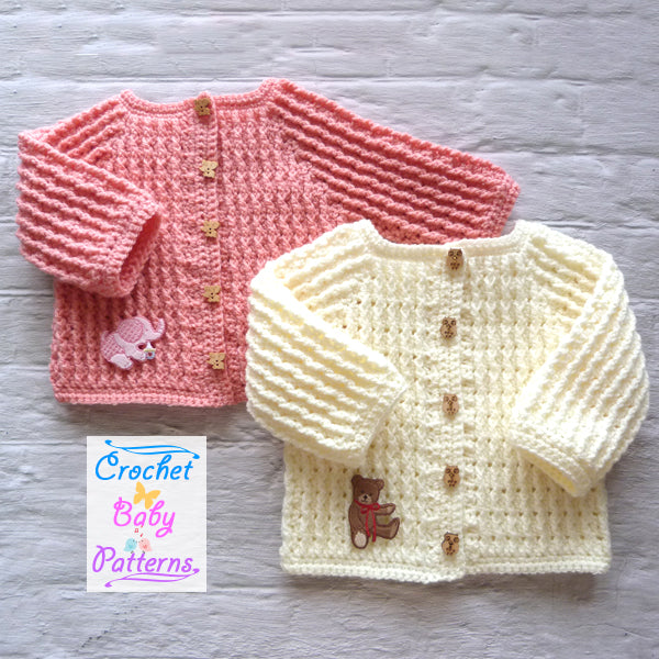A simple cardigan that is ideal to have in your babies wardrobe, make in colours to match any of their little outfits.
