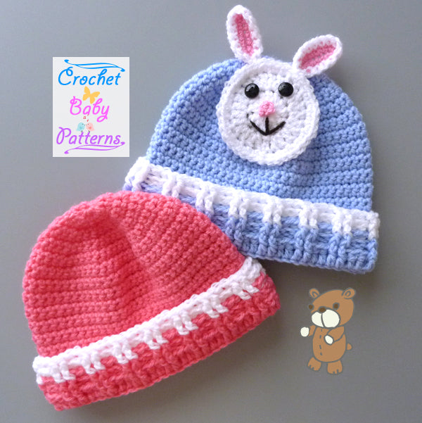 Cute full of fun crochet baby hat with a rabbit appliqué, just right for keeping those little ears warm on cold frosty days!