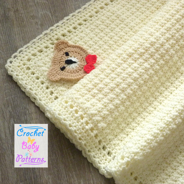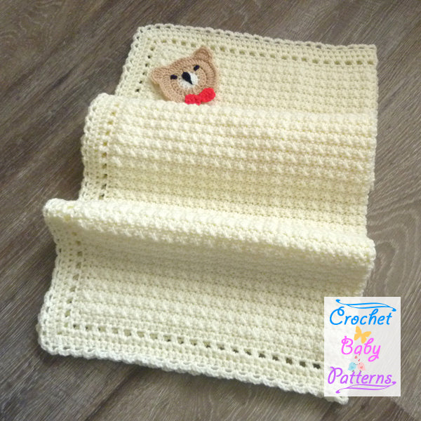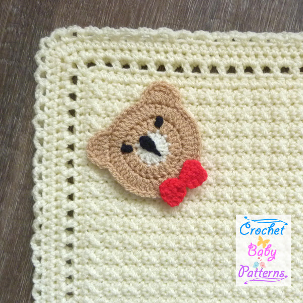 Cute baby cover with a sweet bears head applique, I have used the crumpled griddle stitch for the blanket with a chain edge effect border.