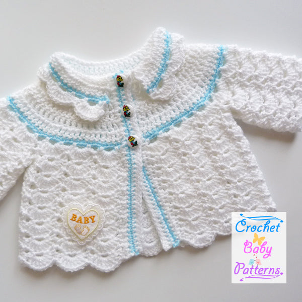 I’m sure any family member or friend would love to make this cute set for the new arrival, it’s an adorable two piece outfit consisting of a collared coat and bloomers. Crocheted in a solid colour and then edged in a contrast colour, suitable for baby boys or girls.