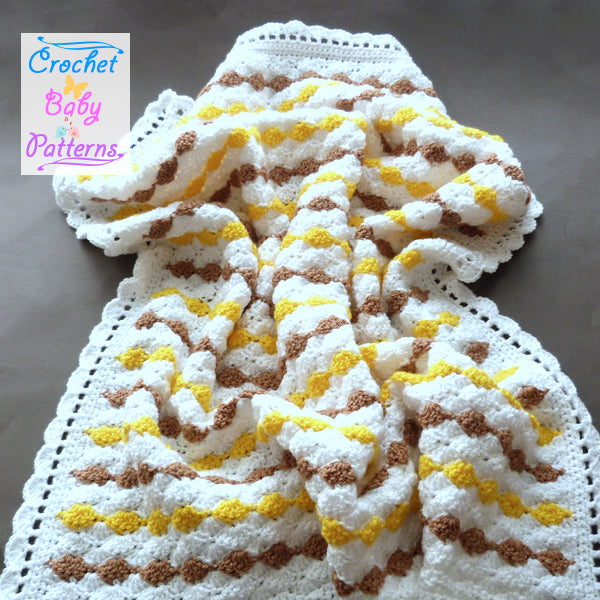 A pretty flurry of shells, this is a close stitch blanket that is warm and cuddly, although I have called it a stroller blanket it can also be used for cribs, cots or prams.