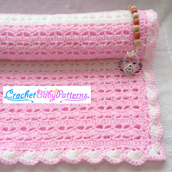 A beautiful soft and cuddly baby blanket, I have made it in pretty pink and white colours, but you can choose your colors to suit the personality of the baby it is for. It is crocheted in an easy lacy shell stitch pattern, this adorable blanket is an ideal take anywhere design.