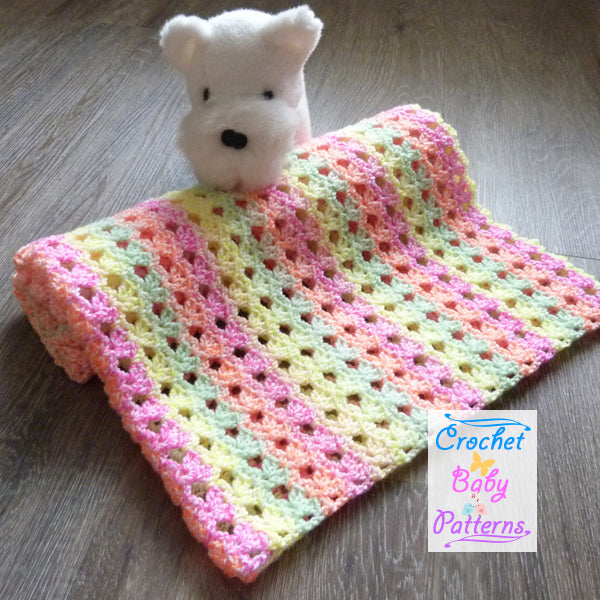 Combining a beautiful pastel colour variegated yarn with an all over shell stitch makes a gorgeous project to crochet. This colourful blanket will give your baby that extra ray of sunshine when in the baby carrier.